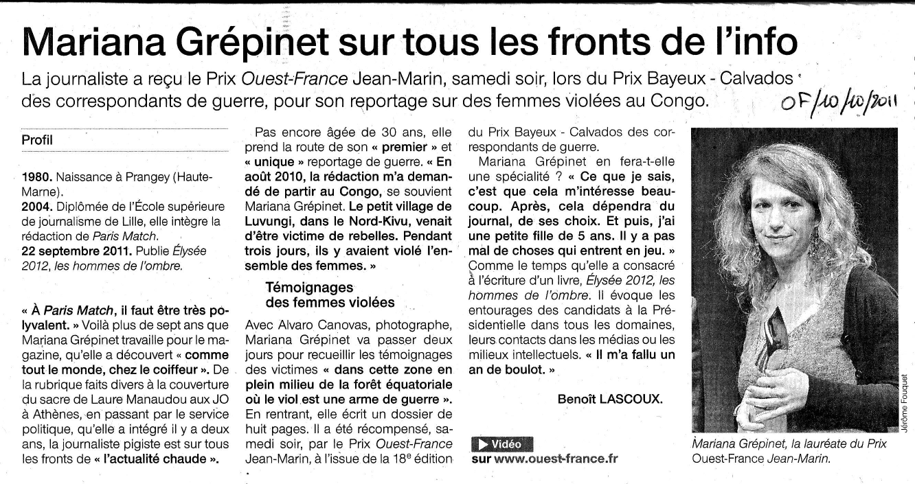 Pour « Les femmes violées de Luvungi », reportage réalisé en septembre 2010 au Congo RDC, j’ai reçu le 1er prix Ouest-France/Jean Marin et le 3ème prix Bayeux catégorie presse écrite.