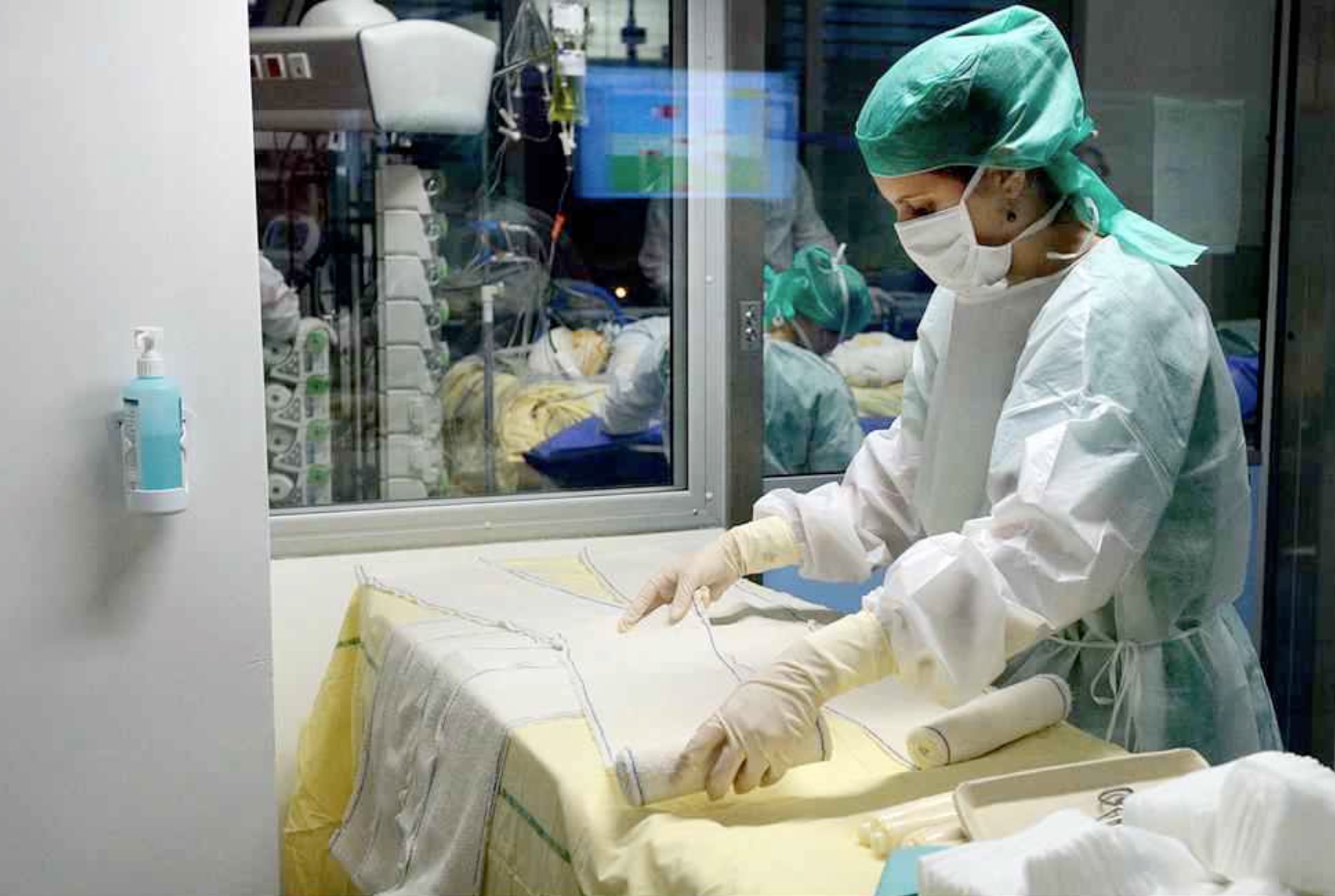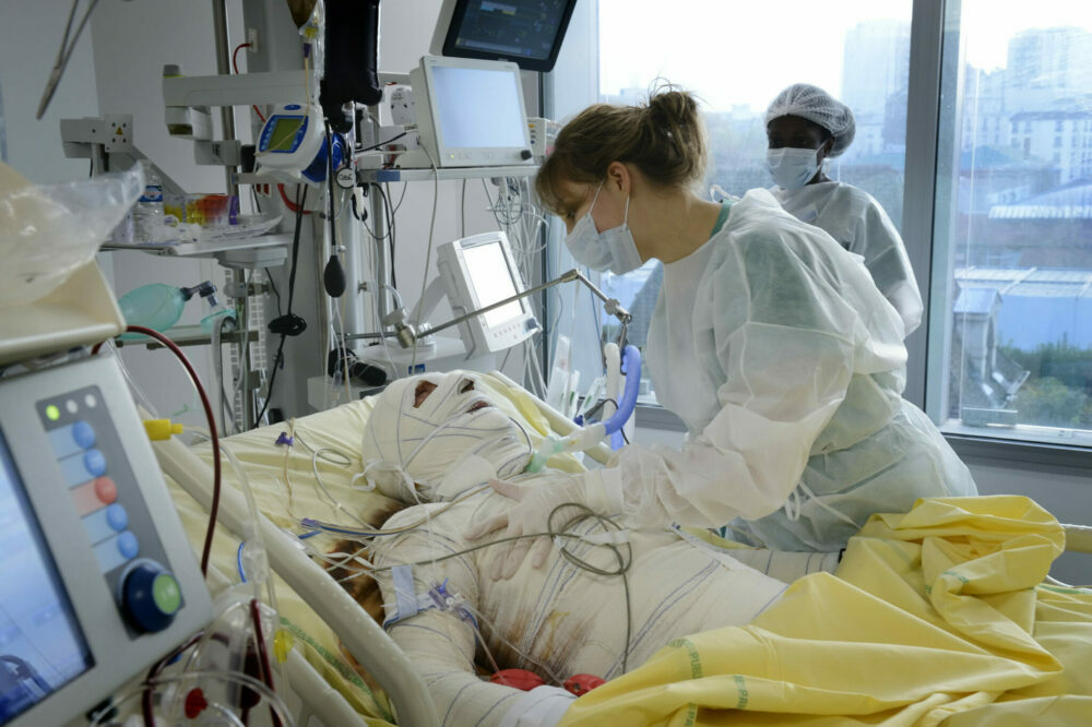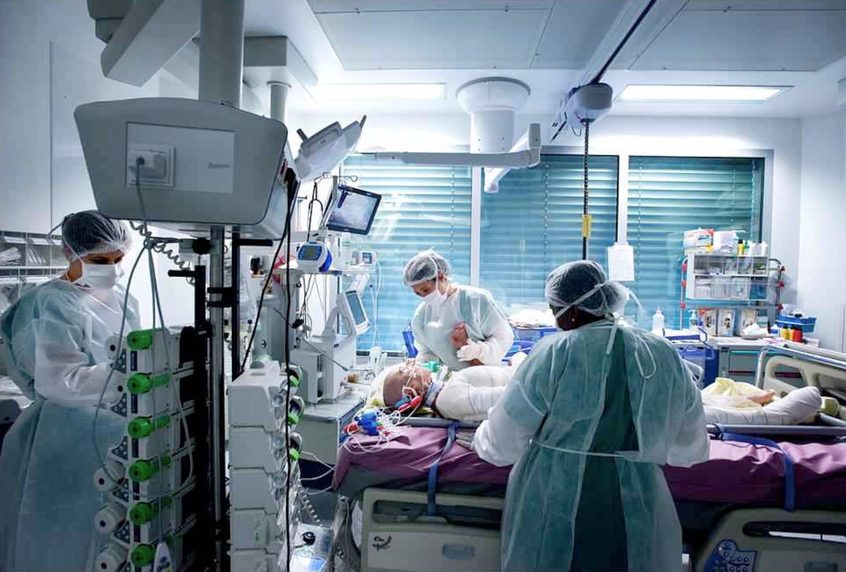 La première fois qu’elle entre dans la chambre d’un patient de l’unité 1, où sont hospitalisés les patients les plus touchés, presque instinctivement, Céline baisse le regard. Elle voit un homme entièrement bandé, de la tête aux pieds, allongé sur son lit. Intubé, inconscient, il est silencieux. Mais autour d’elle, l’appareillage qui le maintient en vie produit un vacarme assourdissant : des vagues de sonnettes retentissent, la soufflerie qui permet de purifier l’air fonctionne à fond. Les machines clignotent à intervalles réguliers. Par ses yeux, je vois tout cela. J’entends tous ces bruits.