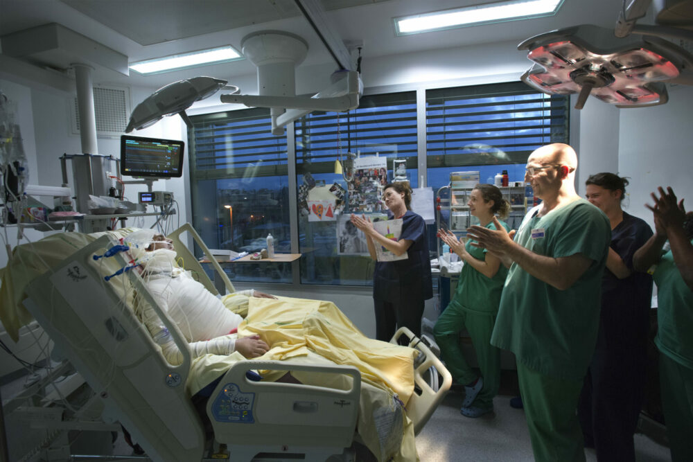 Le professeur et moi avons noué une relation particulière. Fin 2017, nous nous retrouvons lorsqu’il réalise, avec son équipe, une première mondiale : un grand brûlé à 95 % a défié la mort grâce à des greffes de son jumeau. C’est à ce moment-là que l’idée dece filmm’est venue. J’avais envie depuis plusieurs années déjà d’aller plus loin, mais sous une nouvelle forme. De retrouver les soignants qui travaillent et vivent dans ce service. De témoigner de leur engagement au quotidien. Et de m’interroger sur le sens de ce qui se passe dans ce lieu.